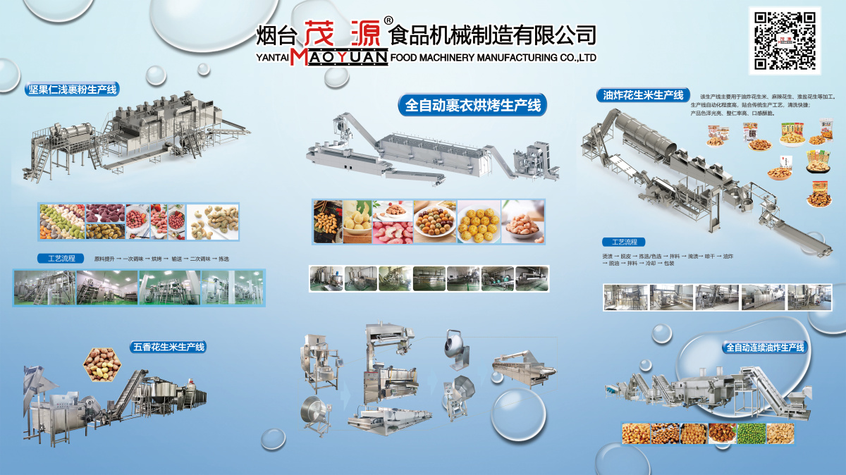 Yantai Maoyuan Food Machinery Manufacturing co.,ltd Established in 1995 .It is a professional manufacturing company integrated with R&D,professional manufacturing, derect sales and after sales service.we have been focusing on the R&D innovation of frying, roasting,peeling,coating and all kinds of snaks food production line, A decisive role in the development of peanut equipment and nuts equipment industry, has become the industry benchmark enterprise.
