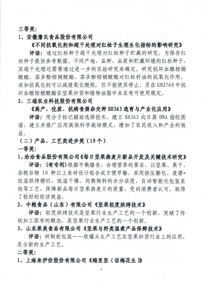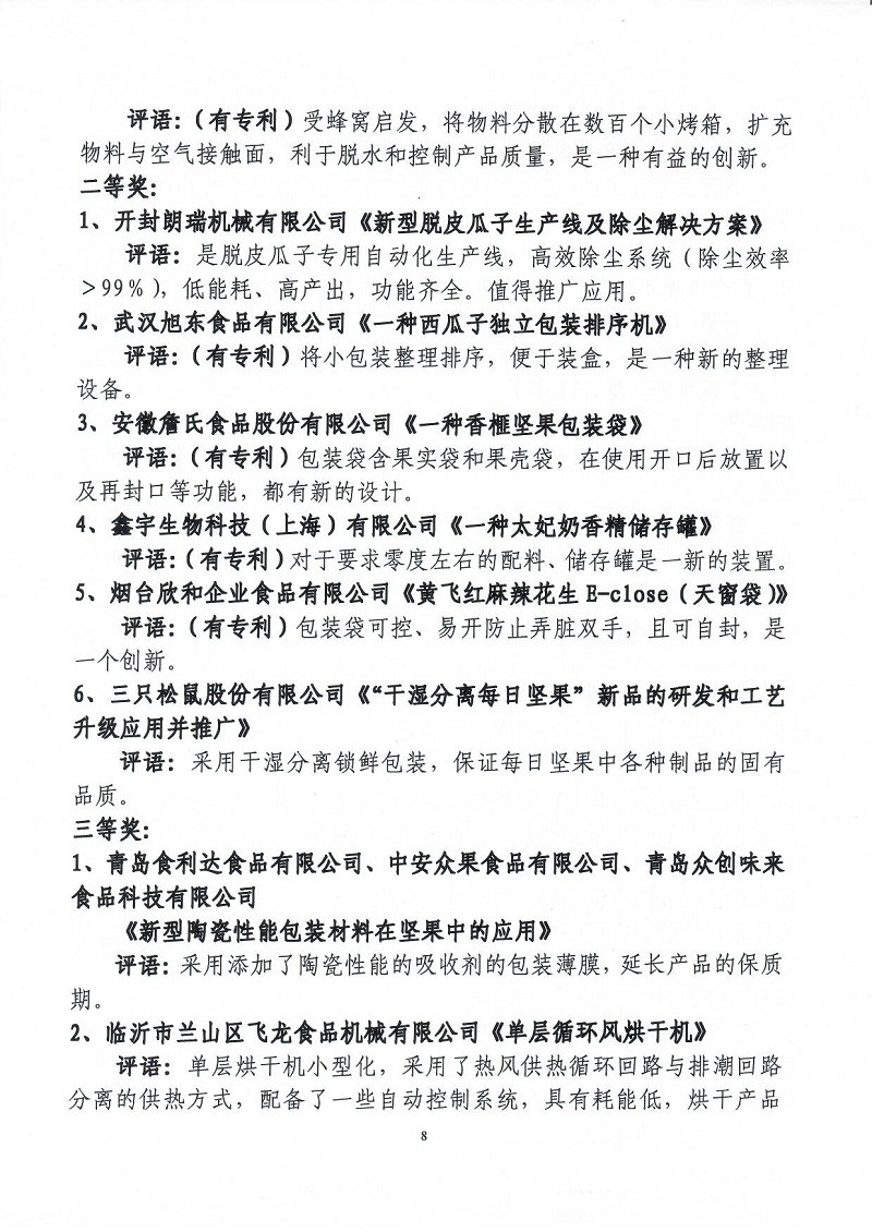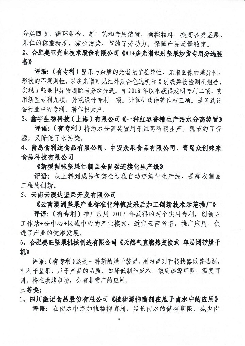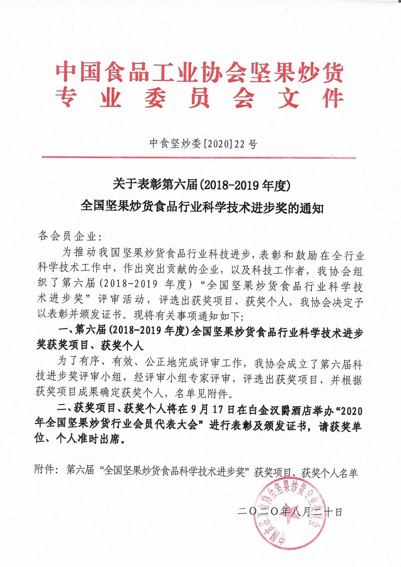 關(guān)于表彰第六屆(2018-2019年度)全國(guó)堅(jiān)果炒貨食品行業(yè)科學(xué)技術(shù)進(jìn)步獎(jiǎng)的通知