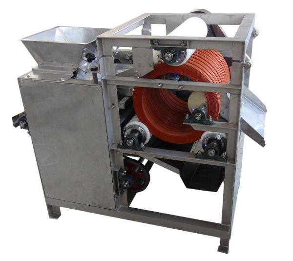 將經(jīng)浸泡的蠶豆倒入料斗,經(jīng)震動進料使原料進入由三個動力輥固定的旋轉(zhuǎn)膠輪之間的夾縫,在進料輪的作用下,經(jīng)過刀片將原料外皮切口,然后由出料輪排出。