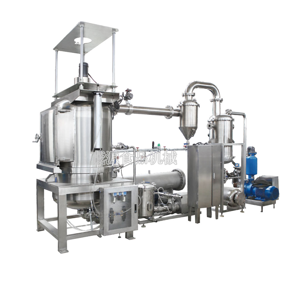 在真空(負壓)的狀態(tài)下,食品中的水分汽化溫度降低,真空低溫脫水機以食用植物油作為傳熱媒介,使食品中的水分急劇蒸發(fā)而噴出,從而實現低溫條件下對食品的油炸。